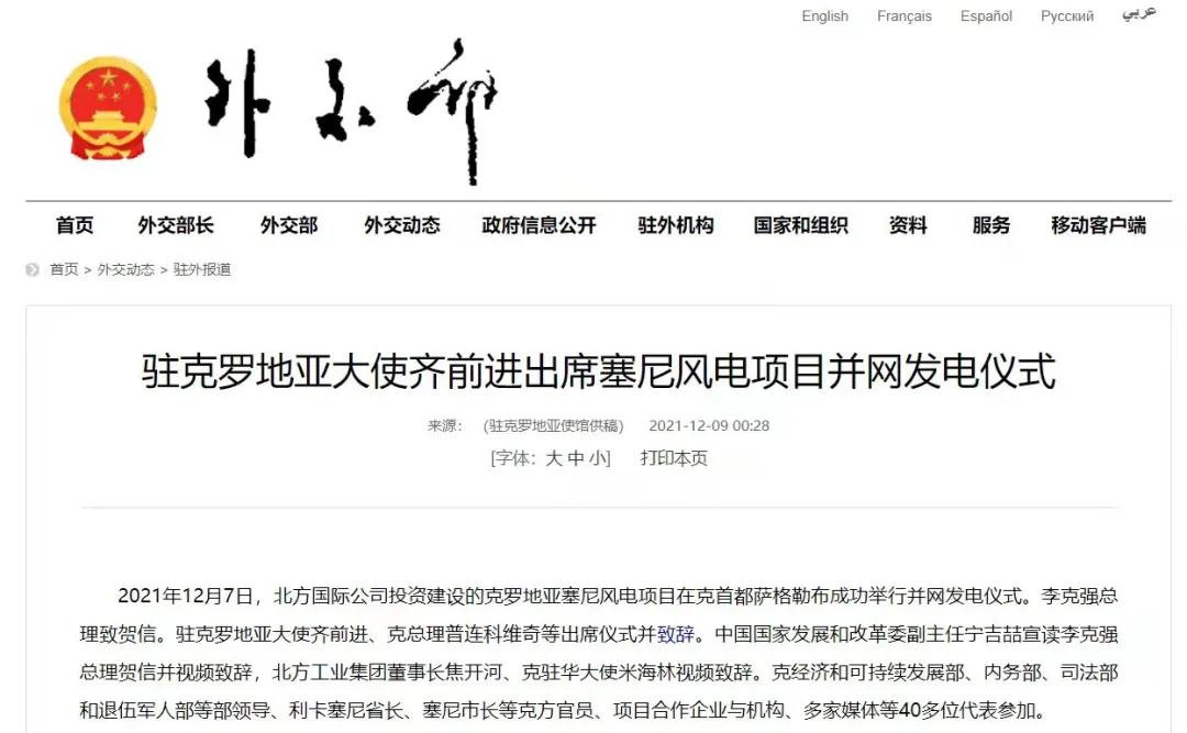2021年12月7日,中國兵器工業(yè)集團有限公司北方公司所屬北方國際投資、建設和運營的塞尼156MW風電項目在克羅地亞首都薩格勒布隆重舉行并網(wǎng)發(fā)電儀式。李克強總理致賀信??肆_地亞總理安德烈·普連科維奇,中國駐克羅地亞大使齊前進出席儀式并致辭。中國國家發(fā)展和改革委員會副主任寧吉喆宣讀李克強總理賀信并視頻致辭,中國兵器工業(yè)集團有限公司董事長焦開河、克駐華大使米海林視頻致辭。 中華人民共和國外交部報道 普連科維奇總理在致辭中表示,感謝李克強總理發(fā)來賀信,他與中國領導人一直非常重視塞尼風電項目投資與建設。祝賀項目克服疫情與地震等影響,成功并網(wǎng)發(fā)電。增加清潔可再生能源、綠色電力對克乃至歐洲都很重要,克政府的重要戰(zhàn)略和目標之一就是低碳發(fā)展和增加清潔能源供應。塞尼風電項目占克總發(fā)電量將達3.5%,對克實現(xiàn)2022年可再生能源比例30%目標具有很大幫助。此次投資使北方國際成為在克最大的清潔能源投資企業(yè)。非常歡迎更多中國企業(yè)擴大對克投資。 寧吉喆宣讀李克強總理賀信并視頻致辭時表示,2017年11月第六次中國—中東歐國家領導人會晤期間,在李克強總理和普連科維奇總理等中東歐16國領導人的共同見證下,塞尼項目簽署了協(xié)議。項目既是中國堅定踐行綠色發(fā)展理念的具體體現(xiàn),也是中國深化與克羅地亞、與中東歐國家務實合作的生動實踐。希望中克兩國政府部門,企業(yè)等有關各方共同努力、相互配合,運營好塞尼項目,打造出中歐綠色合作的樣板,帶動兩國務實合作持續(xù)深入發(fā)展,造福兩國人民。 焦開河在致辭時表示,在塞尼項目投入運營之際,李克強總理專門致信祝賀。作為塞尼項目的投資方、建設方、運營方,我們備受鼓舞,深感自豪!未來,中國兵器工業(yè)集團有限公司將繼續(xù)深入貫徹落實習近平總書記重要指示批示精神和李克強總理賀信重要要求,以高標準、可持續(xù)、惠民生為目標,與克方合作伙伴坦誠溝通、攜手并進,進一步推動綠色能源建設,努力打造更多的“一帶一路”標志性、引領性、示范性項目,為鞏固中克戰(zhàn)略合作伙伴關系、推進中克從經(jīng)貿領域到全方位合作貢獻積極力量。 齊前進祝賀塞尼風電項目順利完工和成功并網(wǎng)發(fā)電。他表示,塞尼風電站項目并網(wǎng)發(fā)電是中克兩國領導人親自關注和推動的成果。作為迄今最大的中國在克投資合作項目,塞尼風電項目是中克和中歐綠色合作的典范,對克提高清潔能源生產(chǎn)消費發(fā)揮著重要作用。項目建設過程中為當?shù)嘏囵B(yǎng)了許多工程、技術和管理人才,帶動了當?shù)仄髽I(yè)發(fā)展,增加了就業(yè)和稅收,促進了當?shù)亟?jīng)濟社會發(fā)展,充分體現(xiàn)了中國對外經(jīng)貿合作與“一帶一路”倡議秉持的互利共贏、共同發(fā)展的理念,也是中國積極倡導的綠色低碳發(fā)展合作的典范。 塞尼項目位于克羅地亞中部亞得利亞海沿岸,建設總投資1.79億歐元,總裝機容量156MW,采用39臺4MW風力發(fā)電機組設備,風場面積達42.8平方公里。項目正式運營后,預計每年平均發(fā)電超3000小時,貢獻約5.3億度綠色電力,可減少二氧化碳排放約46萬噸,將為克羅地亞促進能源轉型、發(fā)展綠色經(jīng)濟提供強勁助力,貢獻了“中國智慧”“中國方案”。 來源/中華人民共和國外交部、綜合有關報道 |
